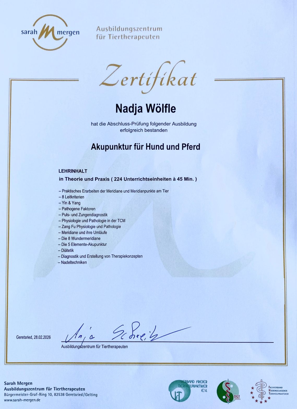 · 2024 – 2026 Ausbildung TCM / Akupunktur für Pferd und Hund, Ausbildungszentrum für Tiertherapeuten Sarah Mergen Geretsried / Bayern